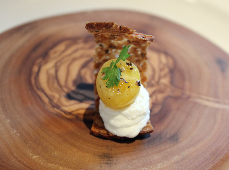 Dinner began with a one-bite amuse of a yellow cherry tomato balanced on a curl of seeded cracker with fluffy goat cheese.