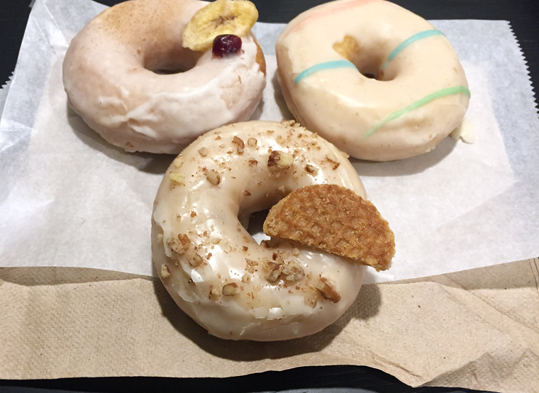 At the small kiosk outside the station, the donuts are $3.25 each. We tried three: Maple Waffle adorned with a mini waffle cookie; the Carwash flavored with vanilla and a very subtle hit of lavender; and Banana Milk, garnished with a banana chip.