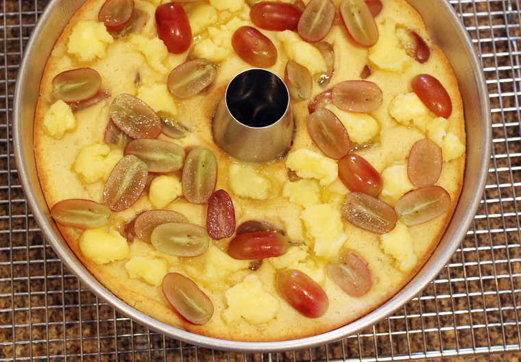 The first addition of grapes gets strewn over the top of the cake right when it first goes in the oven. The second round of grapes go on 20 minutes later when you remove the cake from the oven briefly to add them, as well as pieces of a sugar-butter paste, before returning the cake to the oven at a lowered temperature. What that paste does is create a rather miraculous crackling sugared top.