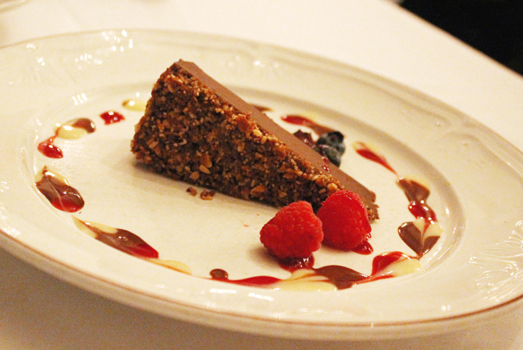 Chocolate torte, its top strewn with sweet, crunchy nuts, tastes like a gourmet candy bar.