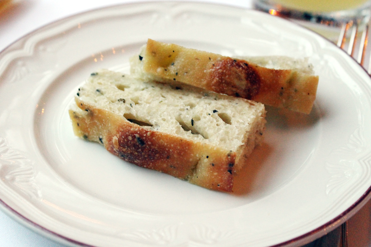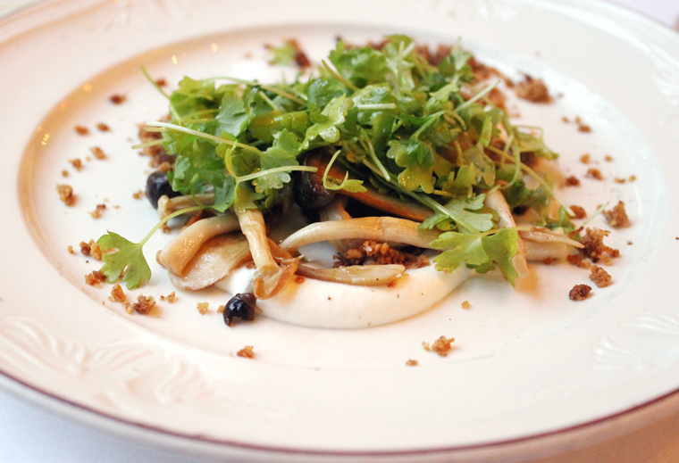 As we nibbled on the airy, house-made focaccia, one of my favorite dishes of the evening arrived: a roasted mushroom salad with porcinis and shimejis enlivened with a smoked goat cheese mousse. What looked like bacon bits actually was hazelnut streusel to lend toasty crunch to every bite. Micro celery leaves were an inspired last touch because the delicate leaves, with their bold celery flavor, added a distinctive brightness to the smoky, meaty, earthy mushrooms.