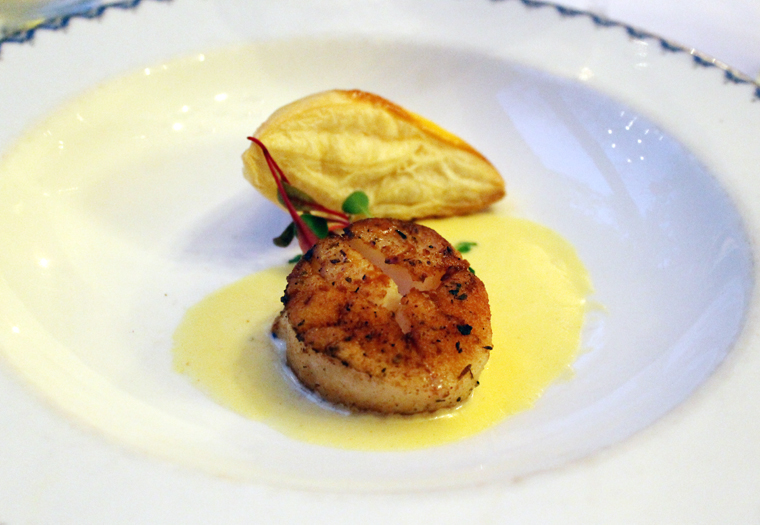 Day boat scallop starred in a deconstructed pot pie. The scallop was nicely seared, and arranged atop a saffron cream sauce. The puff pastry was off to the side, looking a little forlorn. But put it to good use by dragging it through the sauce to enjoy.