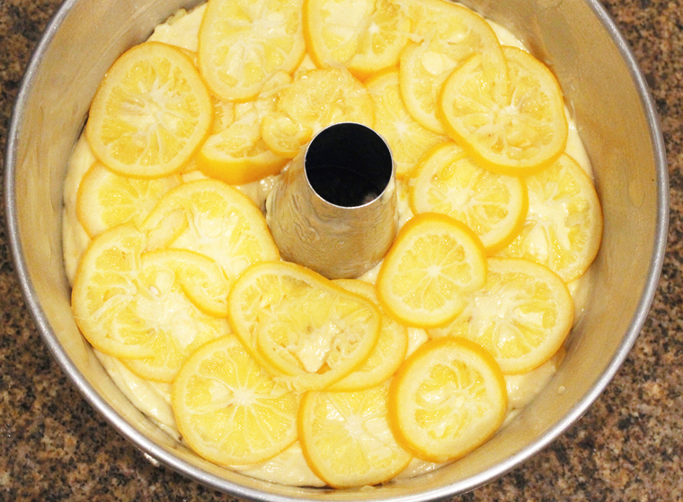 Spoon 1/2 of the batter evenly into cake pan. Arrange 1/2 of the lemon slices in a single layer over the batter. Spread remaining batter evenly over the top. Cover with the remaining lemon slices in a single layer. Sprinkle the chilled streusel evenly over the batter.