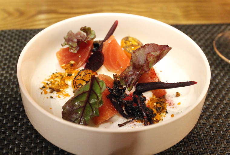 Chiogga and Cylindra beets from Santa Cruz are garnished with beet powder and beet stem marmalade (how clever is that?). The beets are garnished with creamy soft stracciatella cheese, crunchy cocoa nibs that play up the earthy notes of the beets, and charred kumquats that lift the dish with smoky sweet-tartness.