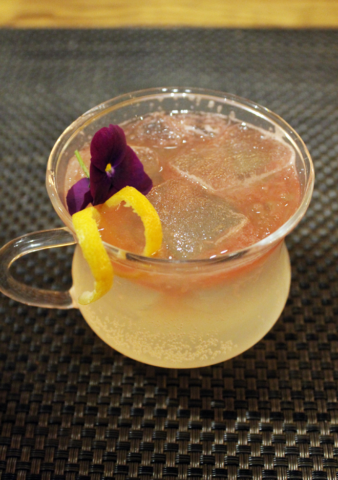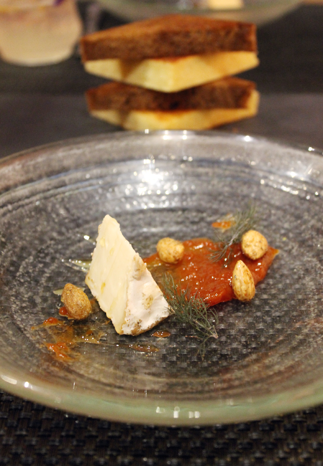 An apertif of hibiscus and sparkling water comes out next, with the server squirting lavender hydrosol over the top of the glass after setting it down. It’s light, citrus-forward, a little tart, and just a touch sweet.