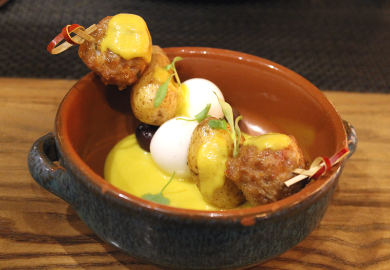 Quite a few of the tasting menu items come from the regular menu, so this is a fun way to try a lot of things at once. That includes the chicken meatballs with fingerlings, a hard-boiled quail’s egg and olives threaded on skewers. The meatballs are juicy and shot through with a lot of lime.