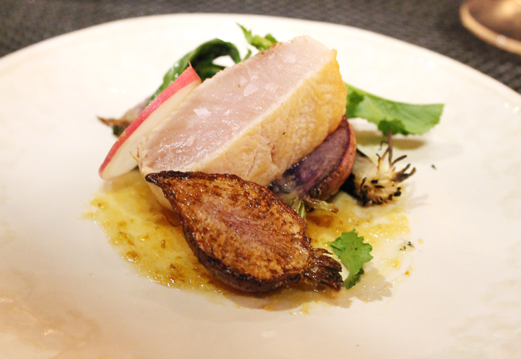 Next it was a slab of Japanese hamachi, seared gently only on the outside and left raw within, done up with floral gently sweet-tangy umeboshi caramel.