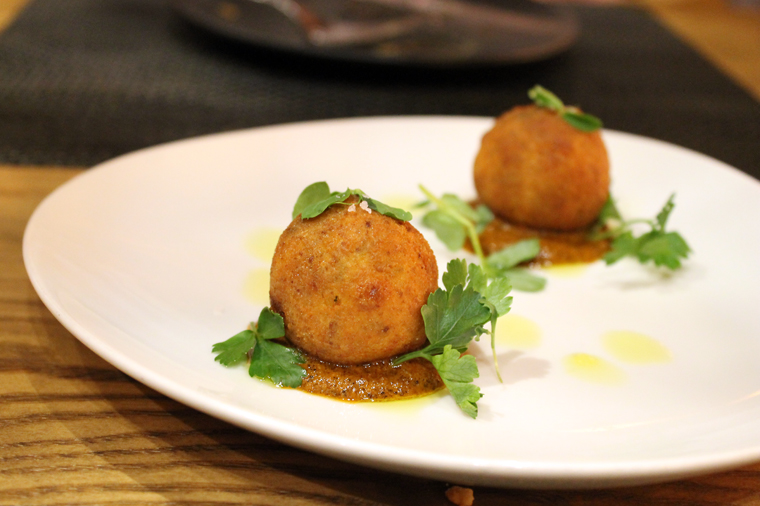 Salt cod croquettes are golden on the outside, and fluffy inside, with an assertively delicious ancho chili romesco that’s big on earthy and peppery notes.
