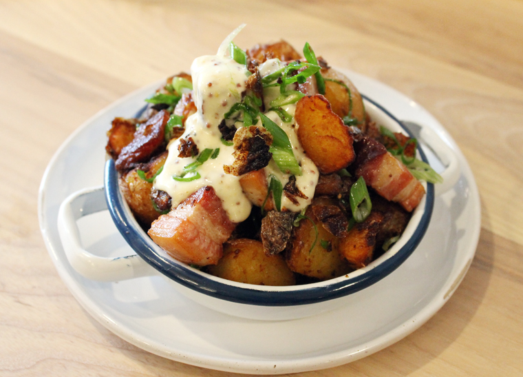 Who can ever resist crispy potatoes? Here, you can have them three ways, including Bacon & Onion ($9). In this version, the crisp potato halves with creamy interiors are tossed with chunks of bacon so thick and rich, they are more akin to pork belly. A mustard aioli adds a spark of piquancy and creaminess to tie it all together. With a fried egg on top, this would make a satisfying breakfast, too.