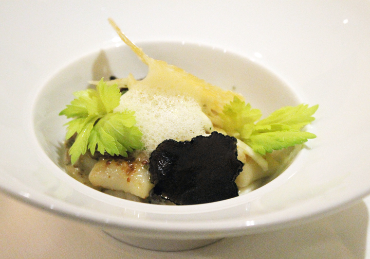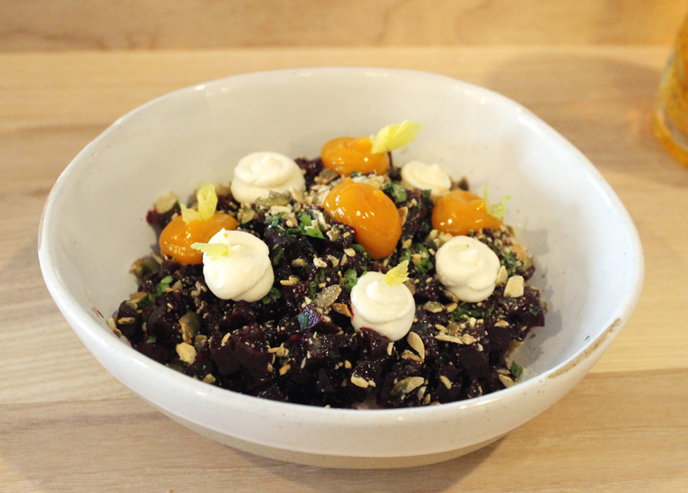 Beets & Wheats ($14) is a vibrant chopped beet salad with toasted seeds and grains dotted with squirts of orange puree, almond ricotta and horseradish. The sweet-earthy taste of beets is intense. It’s a pretty dish, too, and a nice change of pace from the over-done beet and goat cheese salad so ubiquitous elsewhere.