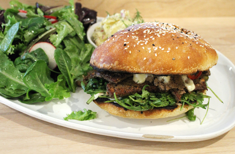 The Impossible Doner Kebap ($19) is made with Impossible Food’s faux meat that’s a blend of wheat protein, coconut oil, potato protein and soy protein. Lopez-Alt has highly seasoned it with sumac, cumin, oregano and other spices to make this incredibly flavorful. It mimics gyro meat so well that it would probably fool most people who wouldn’t know that it was actually vegan. The slices are piled on a Turkish, sesame seed bun with pickled cucumbers, chiles, red onion, arugula and cilantro.