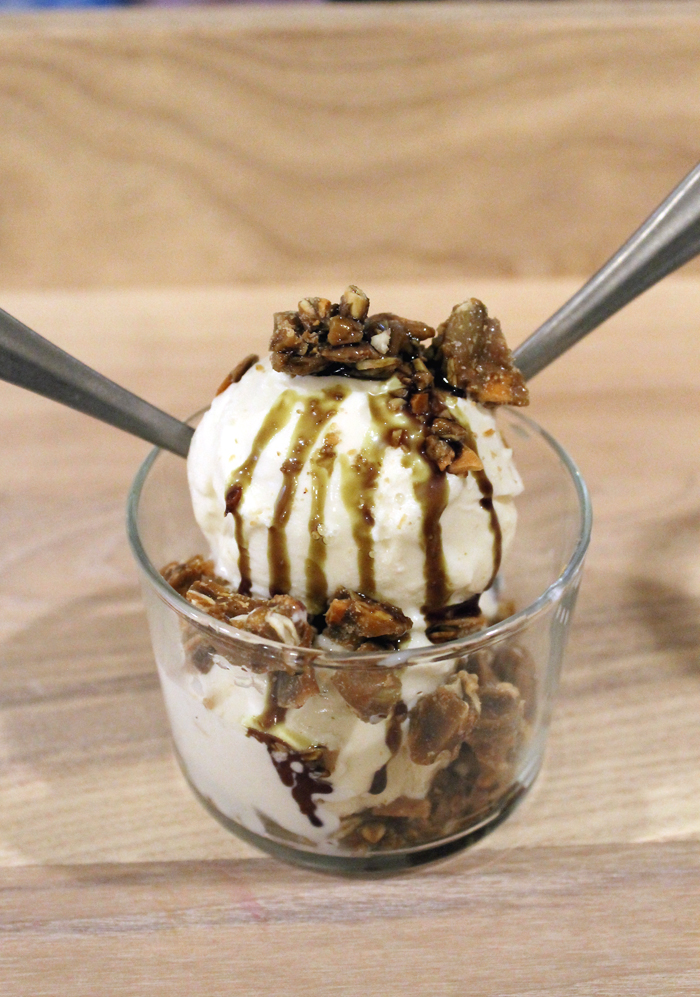 The only dessert available right now is the Pumpkin Seed Sundae ($7) and it’s a winner. Vanilla ice cream gets dressed up with a drizzle of toasty, rich pumpkin seed oil, a sprinkle of sea salt, and pieces of crunchy, wonderful pumpkin seed brittle. It’s toasty tasting, and veering almost into savoriness, which makes this so much more interesting than a typical sundae.