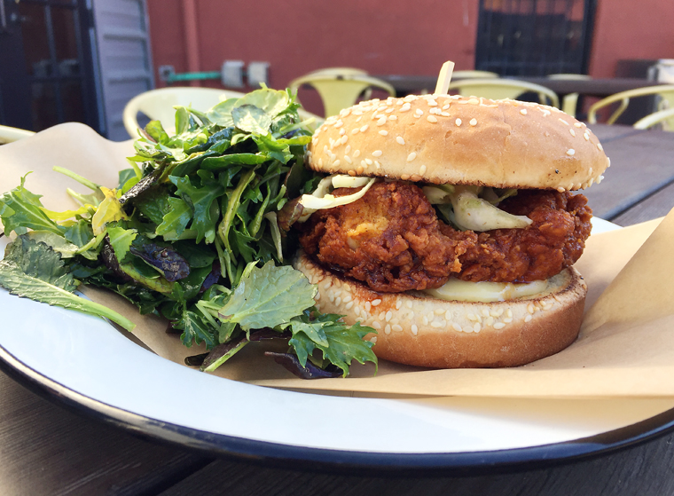 The OK Fried Chicken Sandwich ($14) is a golden, battered piece of pounded chicken thigh snuggled inside a sesame roll with vinegar slaw, hot oil and aioli. It’s super crunchy and the vinegar slaw really wakes it up. You can get it with a side organic greens salad ($1), which are primo plucked leaves dressed in a champagne vinegar-honey vinaigrette.