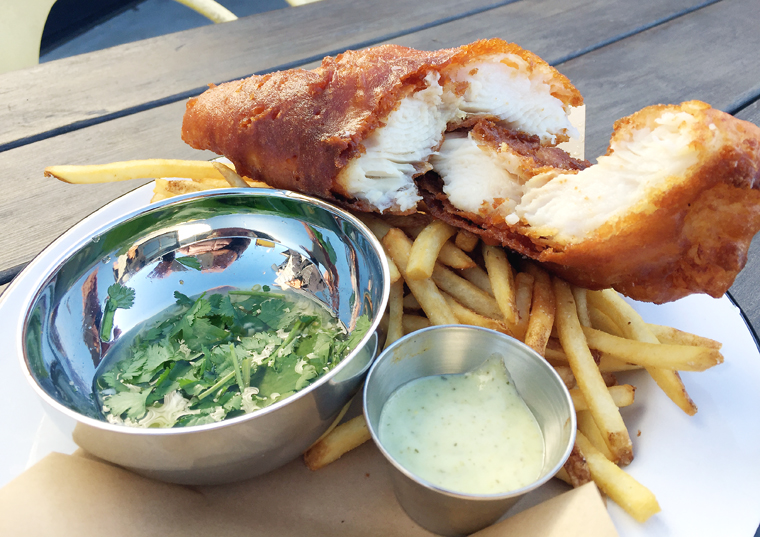 Smack Sauce, a vibrant vinegar-fish sauce-cilantro sauce, is like a Southeast Asian version of British malt vinegar. Also alongside is a ramekin of oyster mayo. It’s a little like Green Goddess, but with a briny note. Dip the fish and French fries into one or the other with abandon — and all is good in the world.