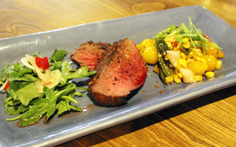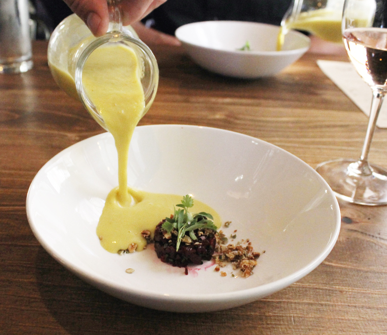 On this warm evening, the beet & fennel gazpacho ($9) definitely satisfies. A shallow plate with a center of diced red beets, toasted garlic and pumpkin seeds is brought to the table before a server pours over it a golden beet gazpacho. The sweet earthiness of the beets is predominant with just a little hit of spice to wake things up. The toasted garlic and pumpkin seeds add texture and pops of extra flavor.