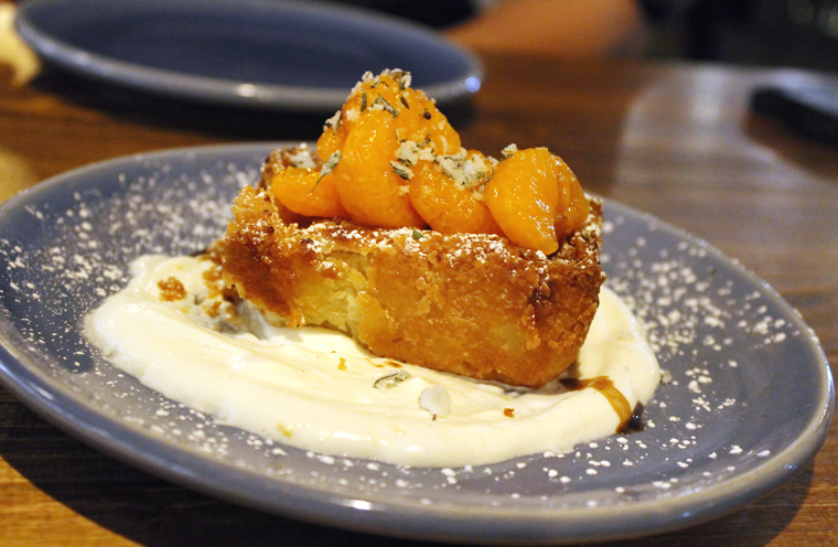 Humphrey handles the desserts, too. Chess pie is like a big wedge of butter cake, soft and moist, with mandarins, candied thyme, and a drizzle of bourbon-barrel-aged vinegar to balance out the sweet.
