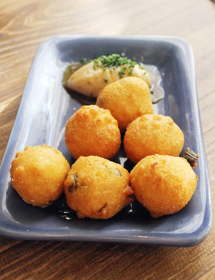 Indeed, he grew up in Florida. One of his other brothers took over their grandfather’s old sugar cane farm there. When Humphrey visits, he brings back sugar cane syrup, which he uses on dishes in the restaurant, most notably the scallion hushpuppies ($8), which he makes just as his grandfather used to. The crisp and fluffy balls taste heavenly of pure corn, and get sweetened dipped into the sugar cane syrup butter that has an almost sorgham-like taste. Humphrey serves 6 hushpuppies to an order — to represent his parents and four siblings.