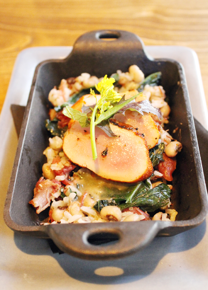 Humphrey brines pork tenderloin ($21) so it cooks up juicy, serving it medium-rare, dusted in spicy Caujun seasoning. Hoppin’ John with white rice and mustard greens gets doused with lovely ham hock jus. It’s all served in a little cast iron pan — the perfect comfort food, Southern-style.