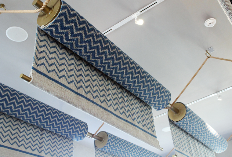 There are actual blue doors (from which the restaurant takes its name) hung on the ceiling horizontally in one area; in another, blue and white rolls of tapestry appearing as if they will unfurl from the ceiling.
