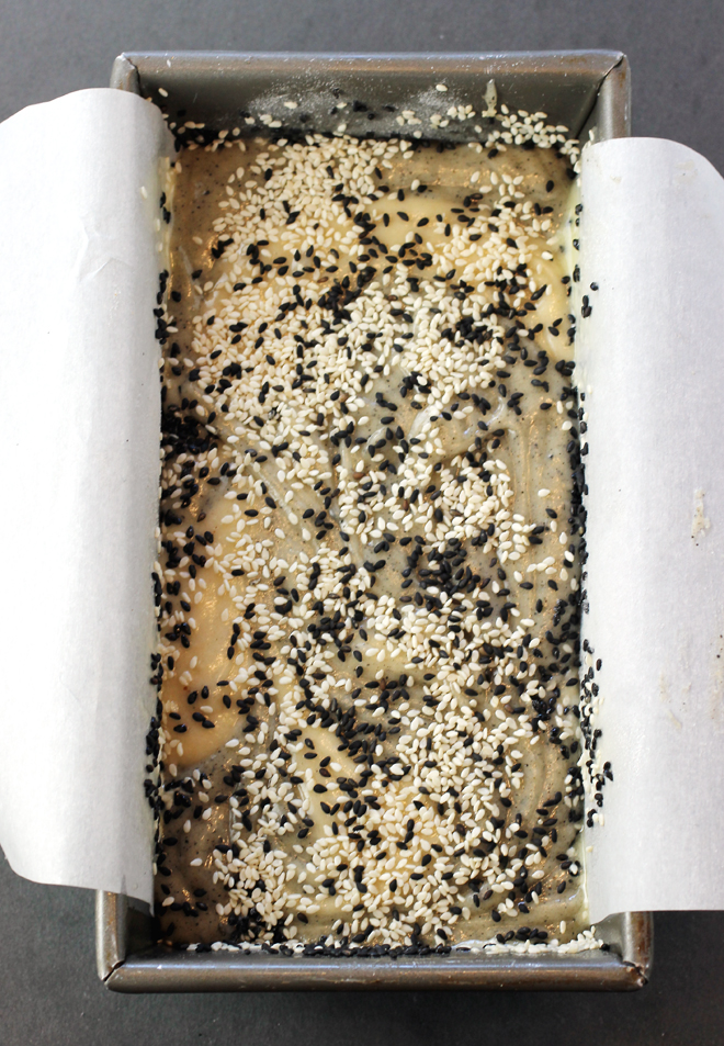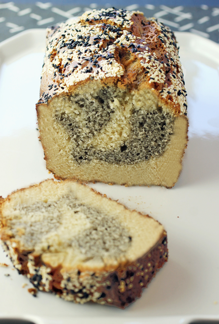 The swirl is created by reserving half of the batter to mix in ground black sesame seeds. Then the regular batter and the black sesame batter are dolloped into the baking pan before you run a knife through it all in a figure “8.”