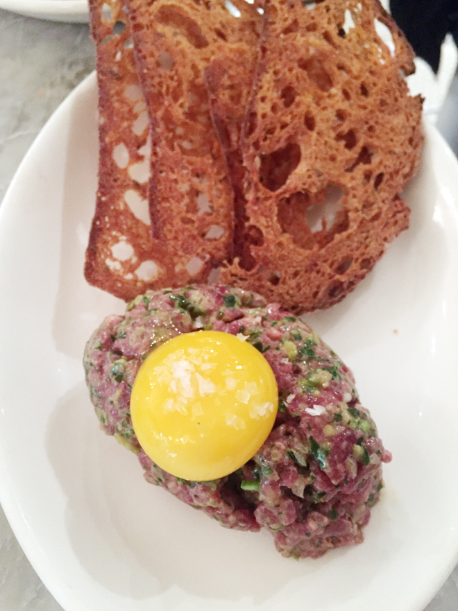 The steak tartare ($16) arrives with a golden egg yolk on top to mix in for added unctuousness. The meat is tender, with a pure, clean taste.
