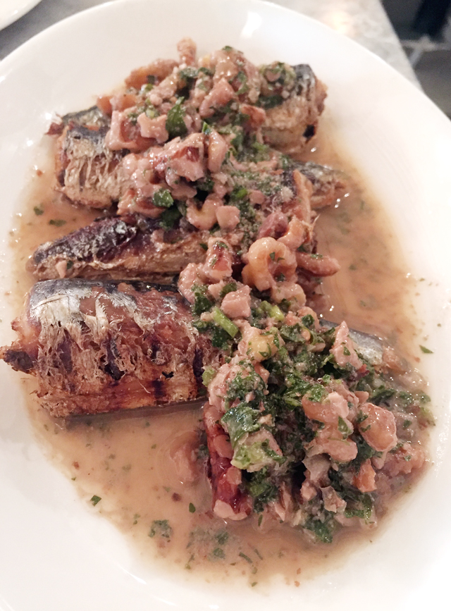 Even after sardines at Barnacle, we ordered more sardines ($13), grilled, and topped with a profusion of chopped walnuts, parsley, shallots and olive oil. The skin on the sardines was super crisp and the flesh so meaty. The fish may be small, but they definitely are big on flavor.