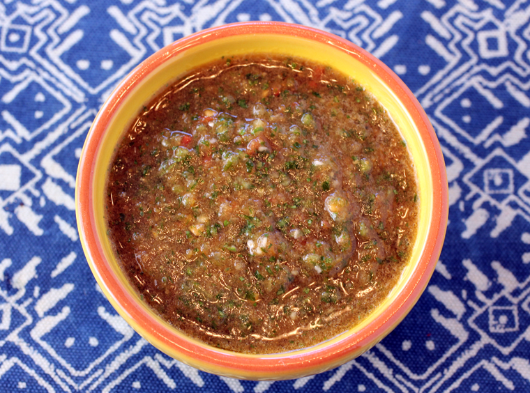 Place tomatoes, cilantro, garlic, green chile, and cumin seeds in a blender and blend to a fine paste — don’t be tempted to add any water.