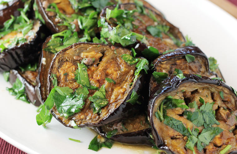 This dead-simple recipe requires only roasted sliced eggplant before tossing with a vinaigrette. That’s it.