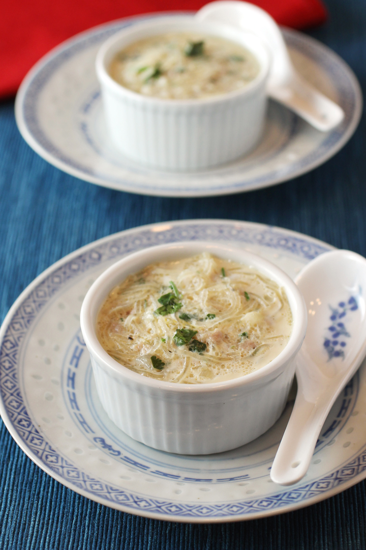 One of the dishes I most fondly remember my Mom making when I was a kid was a Chinese savory custard, redolent of seasoned ground pork and with a surprise duck egg yolk the color of a Hawaiian sunset hidden at its very center.