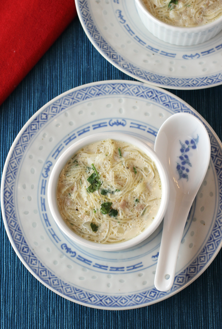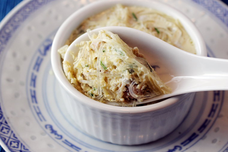Just stir the soaked, chopped noodles together with the pork, herbs, fish sauce, water and eggs, then divide the mixture among ramekins. I actually had 4-ounce ramekins, so I ended up filling seven of them.