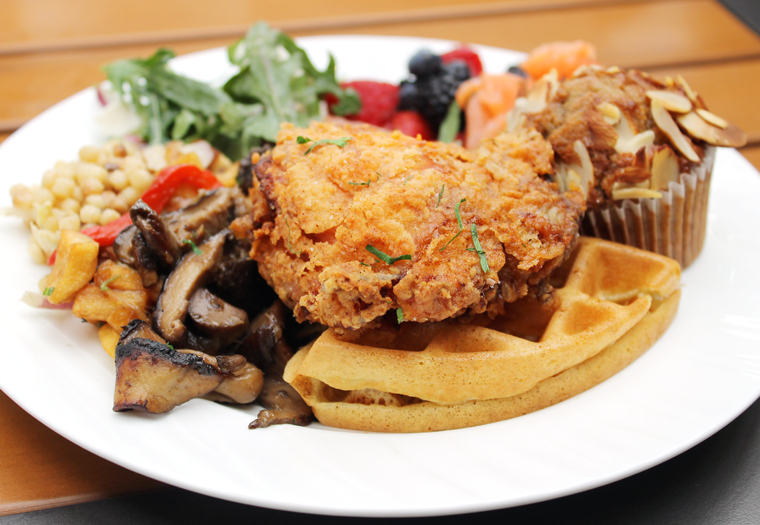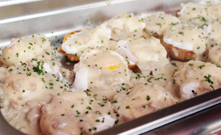 Warming trays hold cheddar biscuits done up with a poached egg and country sausage gravy; pan-seared salmon with a citrus beurre blanc, prime rib with au jus and horseradish, and fried chicken and waffles. There’s also home fries, sauteed mushrooms with herbs, applewood smoked bacon, and chicken and apple sausages, not to mention desserts.