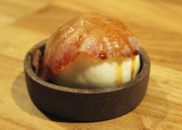 Even an off-menu steamed bun is $25. My late-Dad would probably be appalled that a Chinese bao could sport that kind of price tag. But it is filled with braised, shredded A5 beef shank, then overlayed with a paper-thin slice of A5 Takamori (drunken Wagyu) that Brown torches until its deeply marbled fat gets melty. It’s comfort food done luxuriously for one mighty rich mouthful.