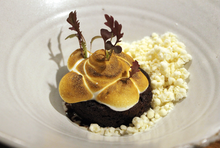 The warm brownie is crisp on the edges and super lush tasting with torched meringue. The dippin dots arrive “smoking” and as cold as ice on the tongue. They are buttery tasting and add just the right amount of saltiness to this decadent dessert.