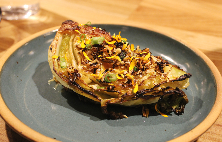 Besides sharing one of those $25 buns, my husband and I started with the 24-hour fermented koji cabbage ($14), a pretty green wedge garnished with baby mustard greens, anchovy aioli, peanuts and crisp puffed rice. The koji gives the cabbage a big hit of umami to go along with its lovely winter sweetness.