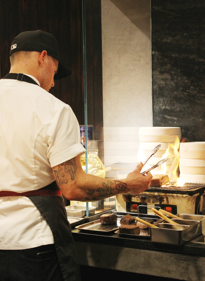 Sitting here is a primal, visceral experience, as you’re just inches from the flames of the hand-cranked main grill that can get up to 900 degrees to cook American prime steaks, and the small custom-built Japanese grill heated with binchotan white charcoal on which the Wagyu is seared.