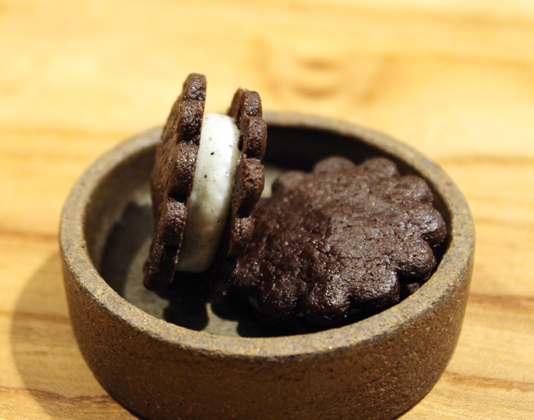 Perhaps to cushion the blow of the check to come, another gift comes from the kitchen — mini Oreo-like cookies. The crisp black sesame chocolate cookies hug a loose, creamy white chocolate filling. When I jokingly asked the server if there was any Wagyu in them, he ribbed back, “Not that I know of. But here, you never know.”