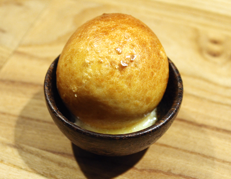 Dinner begins with a gift from the kitchen — a warm, golden buttery brioche bun snuggled in a tiny saucer that has a pool of Wagyu butter underneath that you can gild the lily with.