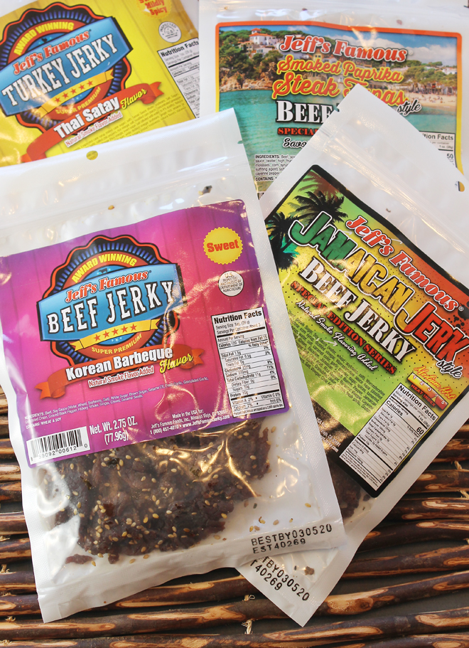 Yes, I bypassed the usual glug of coconut water or bite of banana for a dried meat product instead — Jeff’s Famous Beef Jerky, of which I had just received samples of its newest flavors.