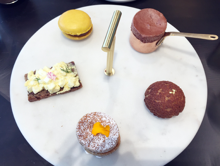 The Afternoon Chocolate Tea arrives on a large round marble serving platter, with each offering about two-bites or so. There’s a citrus macaron, chewy and nutty with an almond meringue sandwich cookie filled with Dandelion chocolate cremeaux, cacao pulp, and a touch of Meyer lemon, and mint jam. The chocolate souffle comes in an adorable doll-size copper pot. It has a crackly-papery brownie-like top, and a creamy, melt-in-your-mouth fluffy center. The taste is thoroughly intense.
