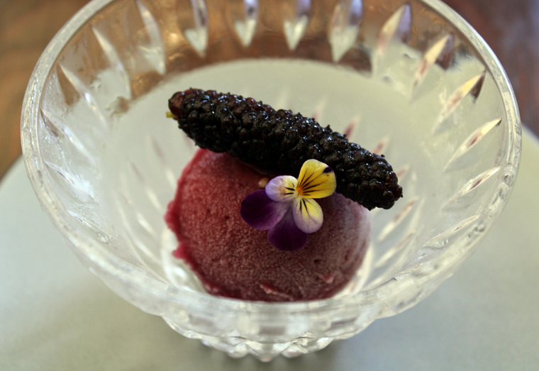Press started experimenting with lees from Dalla Valle Vineyards in much the same way that others are upcycling whey from cheese-making or sourdough cast-off from starters. In this case, the lees or sediment of spent yeast cells after wine fermentation were used in a sorbet served as an intermezzo with a plump mulberry on top. The purple sorbet was refreshing and delicate. It didn’t taste quite of the one-note sweetness of grapes nor fully of wine but rather of something distinctly in between the two.