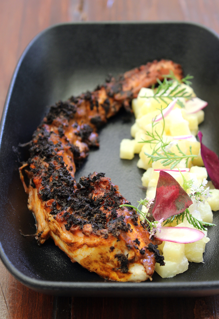 Black truffle makes another appearance in a thick, earthy mole brushed onto very tender charred octopus ($22). Alongside is the most refined looking potato salad — with the tubers cut into precise tiny dice, and not a smushed one among them.