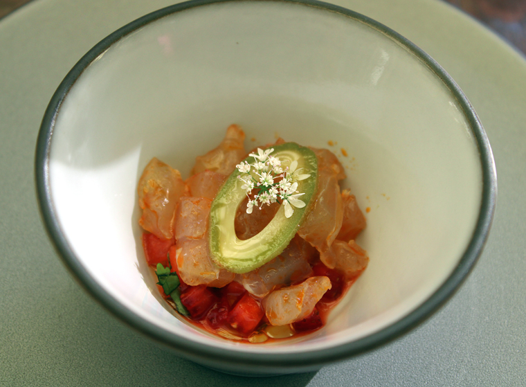 Shortly after we were seated, an amuse arrived: glistening cubes of snapper tartare with fresh strawberries, drizzled with Jimmy Nardello chili oil, and garnished with a slice of juicy green almond. It was a beautiful little treat. Who would have ever thought strawberries and raw fish would go together so well. But the berries only served to accent the natural sweetness of the fish.