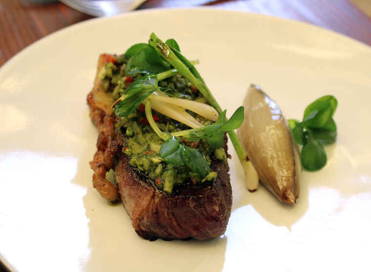 The 35-day-aged New York strip ($65) is garnished with a vibrant, garlicky ramp salsa verde. The caramelized torpedo onion on the plate holds another wonder — it’s stuffed with braised short rib meat. For my husband, aka Meat Boy, it proved a dish with double the pleasure.