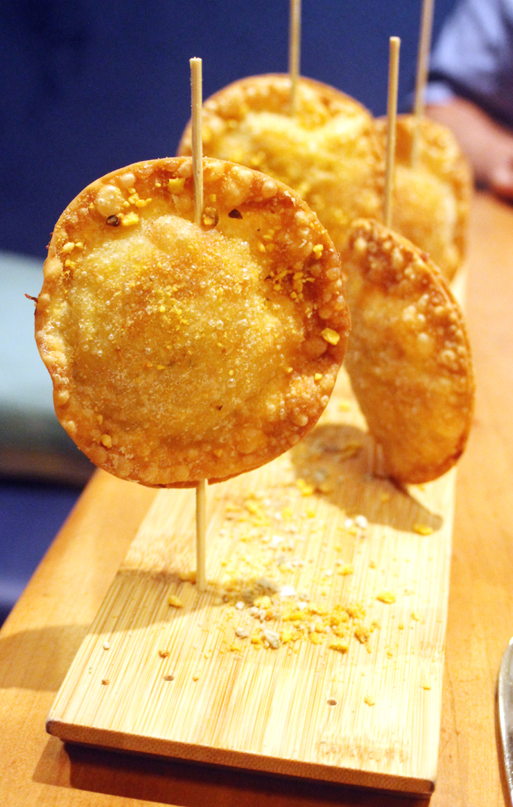 You’ve surely had countless orders of fried calamari, but not like this one. Calamares ($15) brings forth crispy Monterey calamari bodies threaded on a skewer that gets speared dramatically into a log. The tender squid is interspersed with fried thin slices of lemon that make for a fantastic combo, especially when dipped into the accompanying garlicky aioli the color of charcoal from squid ink that adds a touch of brininess.