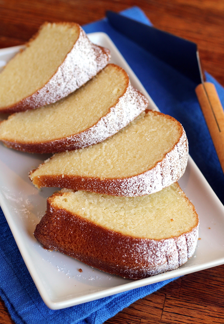 It’s not called pound cake for nothing. The thick batter is enriched with three sticks of butter (3/4 pound), along with six eggs, and a good amount of whole milk.