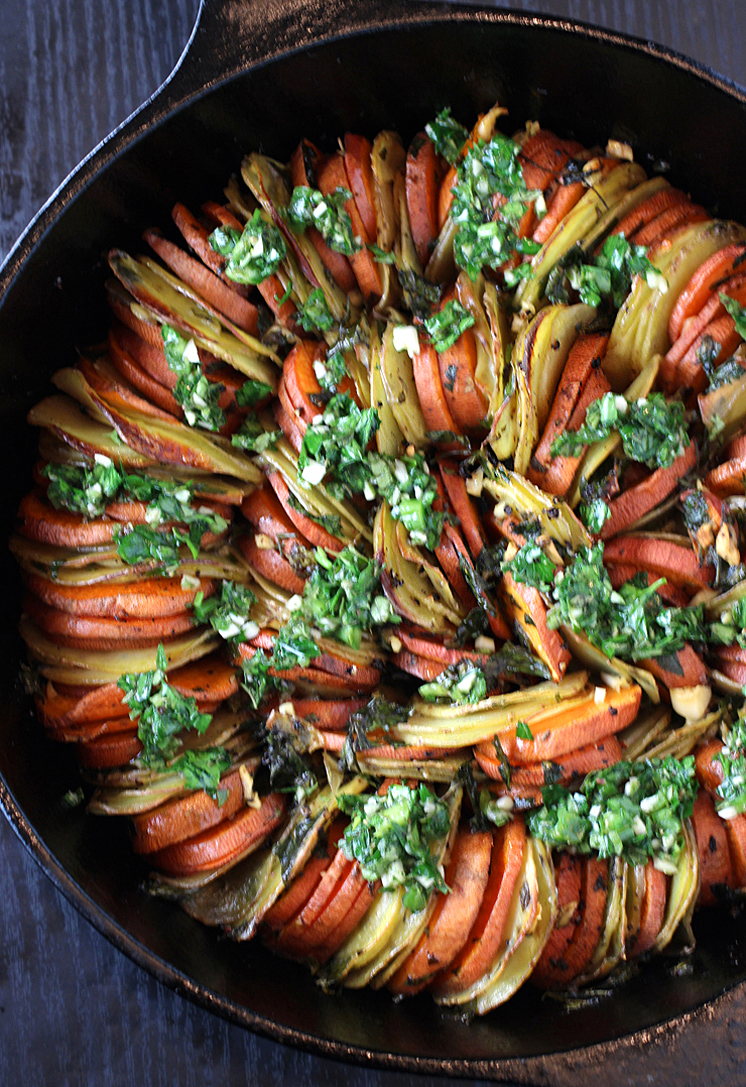 In this particular dish, Yukon Gold and sweet potatoes are cut thinly, seasoned with olive oil, oregano, parsley, and garlic, then overlapped in a concentric circle inside a cast-iron pan. Stock gets poured over the potatoes before the pan is slid into a hot oven.
