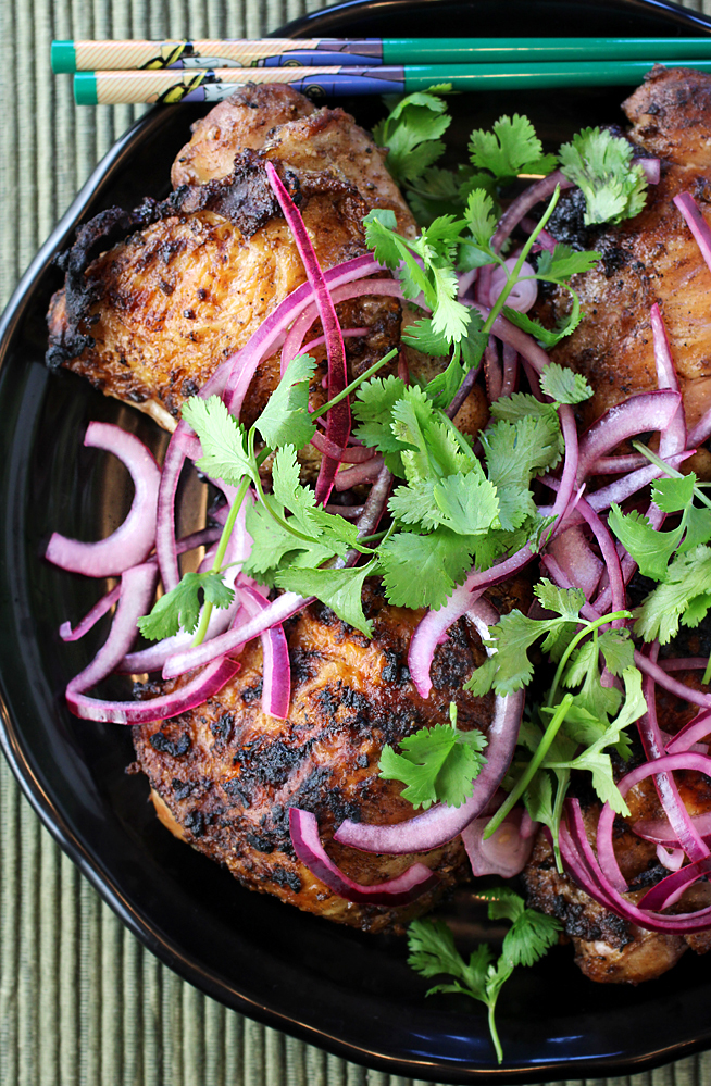 Serve the chicken garnished with cilantro and thin slivers of red onion tossed with a little lime juice, plus a sprinkle of chile flakes, if you like.