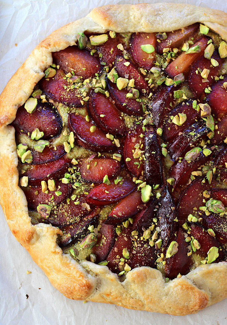Sprinkle on some more chopped pistachios for a final touch, then enjoy. While Gilbert likes to garnish hers with a scoop of ice cream, I like mine just as is to fully appreciate the tangy-sweet taste of the plums alongside the intense nuttiness and slight earthiness of the frangipane.