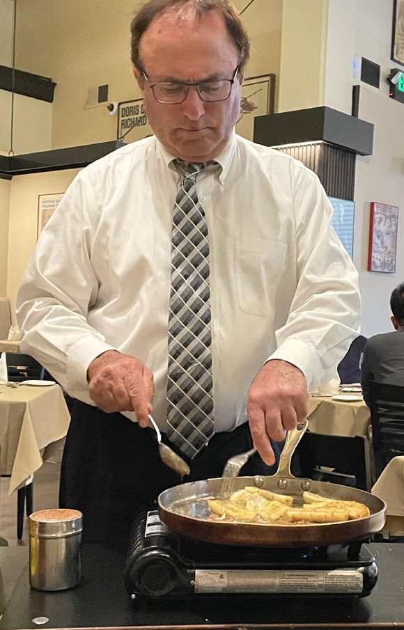 When the flames subside, he spoons the saucy, warm bananas over cold vanilla ice cream. It’s a theatrical dish that never gets old and never ceases to create a magical moment.