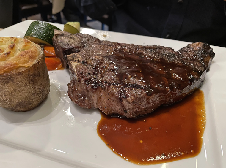 The namesake porterhouse steak can be enjoyed in either a 20-ounce portion for one ($66) or a massive 30-ounce portion for two ($110). My husband opted for the former — and managed to finish it, thus living up to his nickname of Meat Boy. Tender, juicy, and bodaciously beefy tasting, the steak was served with a cheesy, twice-baked potato, and sweet tasting, sauteed carrots and zucchini.